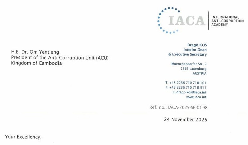 Letter from Mr. Drago KOS, Interim Dean and Executive Secretary of the International Academy Against Corruption (IACA), thanking the Anti-Corruption Unit of the Kingdom of Cambodia for contributing €15,000 to the IACA general budget for 2025. This contribution is to foster the effective implementation of IACA’s work program for the shared goal of global integrity and good governance. ..Read more..