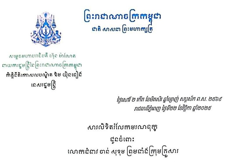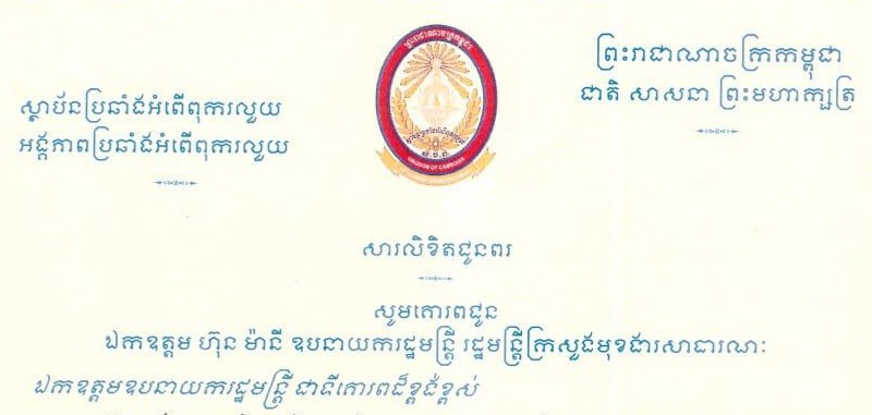 លិខិតជូនពរ របស់ឯកឧត្ដមកិត្តិនីតិកោសលបណ្ឌិត ឱម យ៉ិនទៀង ទេសរដ្ឋមន្រ្តី ប្រធានអង្គភាពប្រឆាំងអំពើពុករលួយ ព្រមទាំងថ្នាក់ដឹកនាំ និងមន្រ្ដីរាជការអង្គភាពប្រឆាំងអំពើពុករលួយ នៃស្ថាប័នប្រឆាំងអំពើពុករលួយ សូមគោរពជូន ឯកឧត្តម ហ៊ុន ម៉ានី ឧបនាយករដ្ឋមន្ត្រី រដ្ឋមន្ត្រីក្រសួងមុខងារសាធារណៈ ក្នុងឱកាសដ៏នក្ខត្តឫក្សវិសេសវិសាល នៃខួបចម្រើនជន្មាយុ របស់ ឯកឧត្តមឧបនាយករដ្ឋមន្ត្រី គម្រប់ ៤២ ឆ្នាំ ឈានចូល ៤៣ ឆ្នាំ នៅថ្ងៃទី២៧ ខែវិច្ឆិកា ឆ្នាំ២០២៥។ ..អានបន្ត..