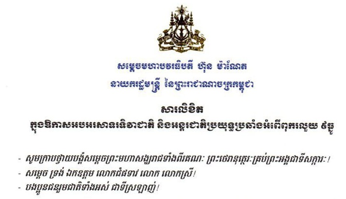 សារលិខិត របស់ សម្តេចមហាបវរធិបតី ហ៊ុន ម៉ាណែត នាយករដ្ឋមន្ត្រី នៃព្រះរាជាណាចក្រកម្ពុជា ក្នុងឱកាសអបអរសាទរទិវាជាតិ និងអន្តរជាតិប្រយុទ្ធប្រឆាំងអំពើពុករលួយ ៩ធ្នូ។ ..អានបន្ត..