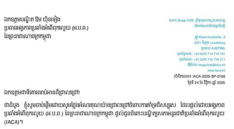 លិខិតរបស់លោក Drago KOS ជាព្រឹទ្ធបុរសបណ្តោះអាសន្ន និងជាលេខាធិការប្រតិបត្តិរបស់បណ្ឌិត្យសភាអន្តរជាតិប្រឆាំងអំពើពុករលួយ (IACA) ថ្លែងអំណរគុណចំពោះអង្គភាពប្រឆាំងអំពើពុករលួយ នៃព្រះរាជាណាចក្រកម្ពុជា ដែលបានបង់វិភាគទានចំនួន ១៥,០០០អឺរ៉ូ ចូលទៅក្នុងកញ្ចប់ថវិកាទូទៅរបស់ IACA សម្រាប់ឆ្នាំ២០២៥។ ការចូលរួមវិភាគទាននេះ គឺដើម្បីជំរុញការអនុវត្តប្រកបដោយប្រសិទ្ធភាពនៃកម្មវិធីការងាររបស់ IACA សម្រាប់គោលដៅរួមនៃសុចរិតភាព និងអភិបាលកិច្ចល្អជាសកល។ ..អានបន្ត..