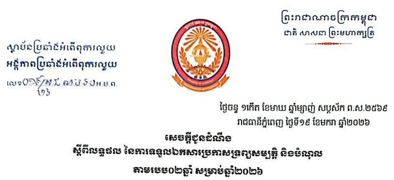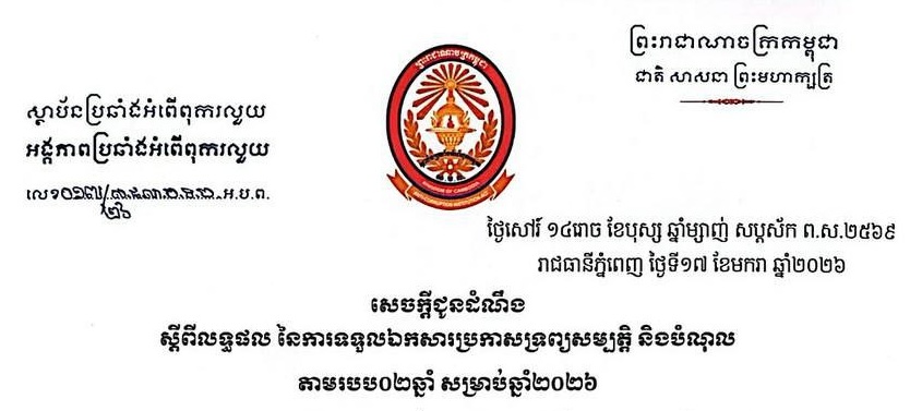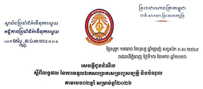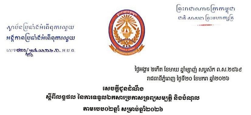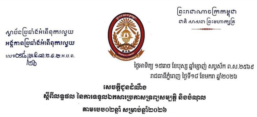សេចក្តីជូនដំណឹង ស្តីពីលទ្ធផល នៃការទទួលឯកសារប្រកាសទ្រព្យសម្បត្តិ និងបំណុល តាមរបប០២ឆ្នាំ សម្រាប់ឆ្នាំ២០២៦ (16/01/2026) ..អានបន្ត..