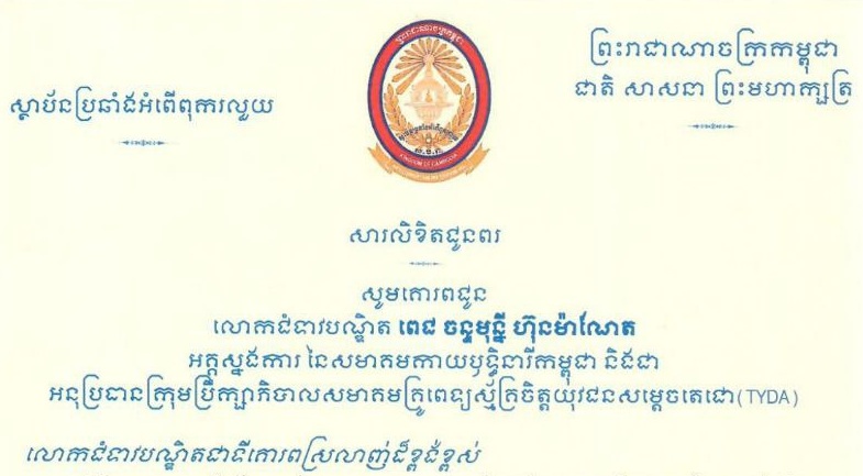 លិខិតជូនពរ របស់ កិត្តិនីតិកោសលបណ្ឌិត ឱម យ៉ិនទៀង ទេសរដ្ឋមន្រ្តី ប្រធានអង្គភាពប្រឆាំងអំពើពុករលួយ ព្រមទាំងថ្នាក់ដឹកនាំ និងមន្រ្ដីរាជការអង្គភាពប្រឆាំងអំពើពុករលួយ សូមគោរពជូន លោកជំទាវបណ្ឌិត ពេជ ចន្ទមុន្នី ហ៊ុនម៉ាណែត អគ្គស្នងការ នៃសមាគមកាយឫទ្ធិនារីកម្ពុជា និងជា អនុប្រធានក្រុមប្រឹក្សាភិបាលសមាគមគ្រូពេទ្យស្ម័គ្រចិត្តយុវជនសម្តេចតេជោ (TYDA) ក្នុងឱកាសប្រារព្ធខួបកំណើតគម្រប់ ៤៥ ឈានចូល ៤៦ ឆ្នាំ របស់ លោកជំទាវបណ្ឌិត នៅថ្ងៃទី២២ ខែមករា ឆ្នាំ២០២៦។ ..អានបន្ត..