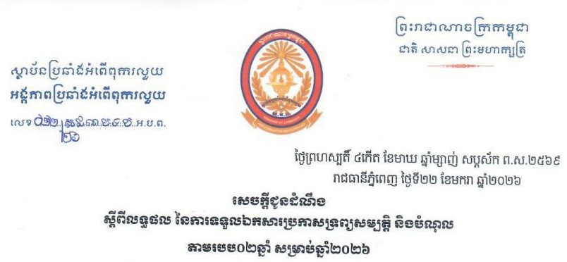 សេចក្តីជូនដំណឹង ស្តីពីលទ្ធផល នៃការទទួលឯកសារប្រកាសទ្រព្យសម្បត្តិ និងបំណុល តាមរបប០២ឆ្នាំ សម្រាប់ឆ្នាំ២០២៦ (21/01/2026) ..អានបន្ត..