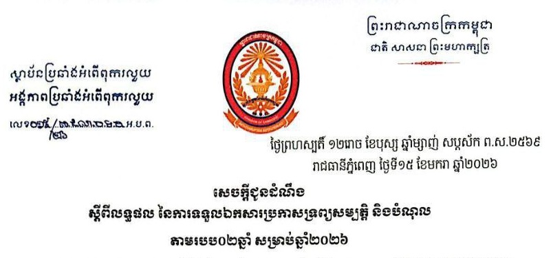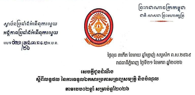 សេចក្តីជូនដំណឹង ស្តីពីលទ្ធផល នៃការទទួលឯកសារប្រកាសទ្រព្យសម្បត្តិ និងបំណុល តាមរបប០២ឆ្នាំ សម្រាប់ឆ្នាំ២០២៦ (20/01/2026) ..អានបន្ត..