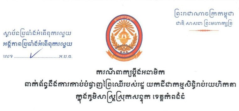 សេចក្ដីប្រកាសព័ត៌មាន ស្ដីពីករណីពាក្យប្តឹងអនាមិកពាក់ព័ន្ធនឹងការកាប់បំផ្លាញព្រៃឈើរបស់រដ្ឋ យកជីជាកម្មសិទ្ធិរាប់រយហិកតា ក្នុងភូមិសាស្ត្រស្រុកសន្ទុក ខេត្តកំពង់ធំ។ ..អានបន្ត..