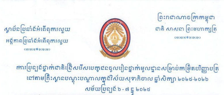 ការប្រឡងថ្នាក់ជាតិជ្រើសរើសបេក្ខជនចូលរៀនថ្នាក់មូលដ្ឋានសម្រាប់កម្រិតបរិញ្ញាបត្រ នៅតាមគ្រឹះស្ថានបណ្តុះបណ្តាលក្នុងវិស័យសុខាភិបាល ឆ្នាំសិក្សា ២០២៥-២០២៦ សម័យប្រឡង ៦-៧ ធ្នូ ២០២៥។ ..អានបន្ត..