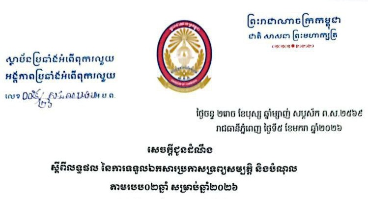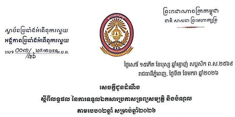 សេចក្តីជូនដំណឹង ស្តីពីលទ្ធផល នៃការទទួលឯកសារប្រកាសទ្រព្យសម្បត្តិ និងបំណុល តាមរបប០២ឆ្នាំ សម្រាប់ឆ្នាំ២០២៦ (01/01/2026) ..អានបន្ត..