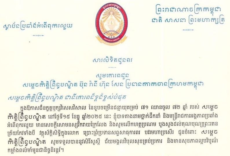 លិខិតជូនពរ របស់ឯកឧត្ដមកិត្តិនីតិកោសលបណ្ឌិត ឱម យ៉ិនទៀង ទេសរដ្ឋមន្រ្តី ប្រធានអង្គភាពប្រឆាំងអំពើពុករលួយ ព្រមទាំងថ្នាក់ដឹកនាំ និងមន្រ្ដីរាជការអង្គភាពប្រឆាំងអំពើពុករលួយ នៃស្ថាប័នប្រឆាំងអំពើពុករលួយ សូមគោរពជូន ឯកឧត្តម ហ៊ុន ម៉ានី ឧបនាយករដ្ឋមន្ត្រី រដ្ឋមន្ត្រីក្រសួងមុខងារសាធារណៈ ក្នុងឱកាសដ៏នក្ខត្តឫក្សវិសេសវិសាល នៃខួបចម្រើនជន្មាយុ របស់ ឯកឧត្តមឧបនាយករដ្ឋមន្ត្រី គម្រប់ ៤២ ឆ្នាំ ឈានចូល ៤៣ ឆ្នាំ នៅថ្ងៃទី២៧ ខែវិច្ឆិកា ឆ្នាំ២០២៥។ ..អានបន្ត..